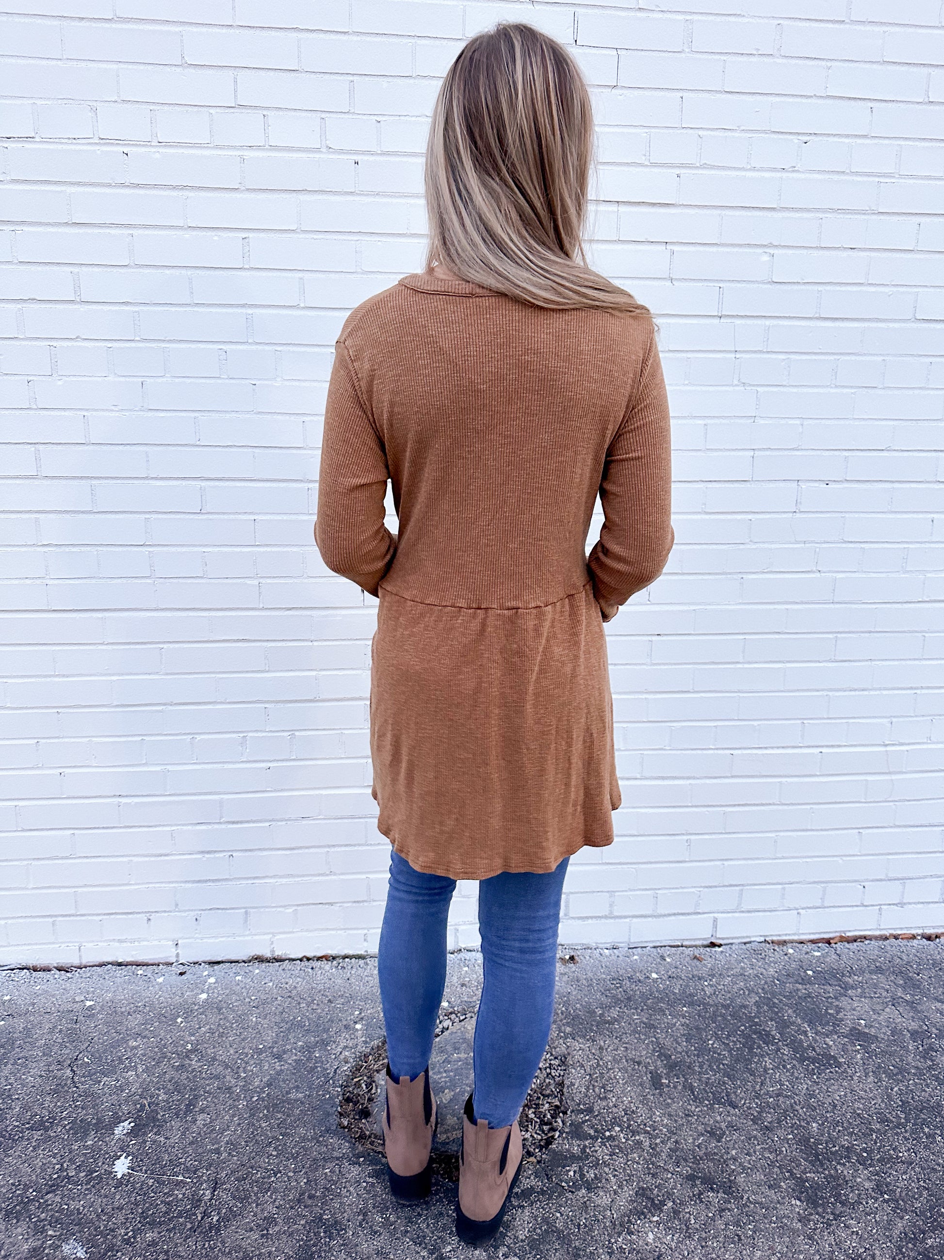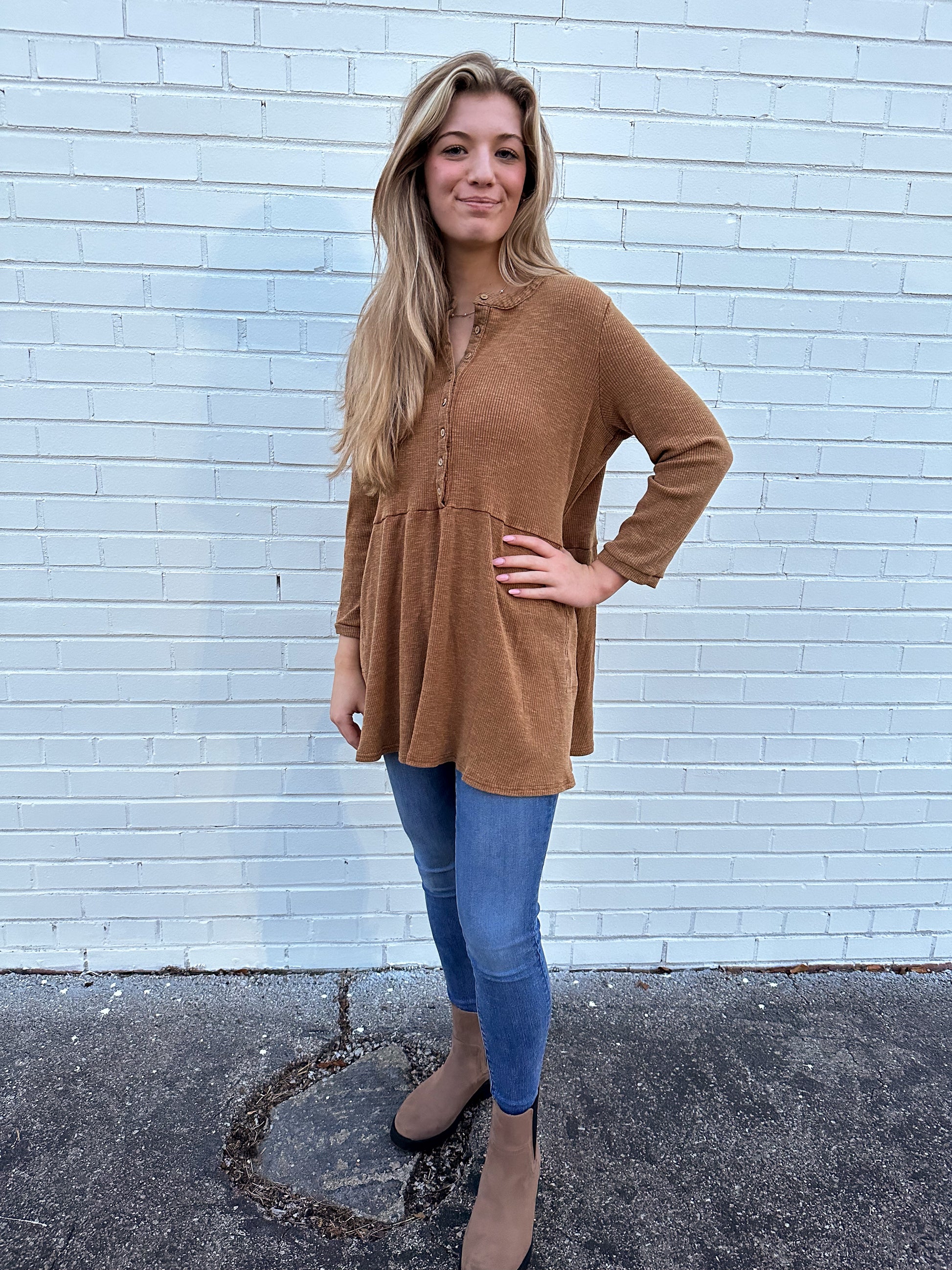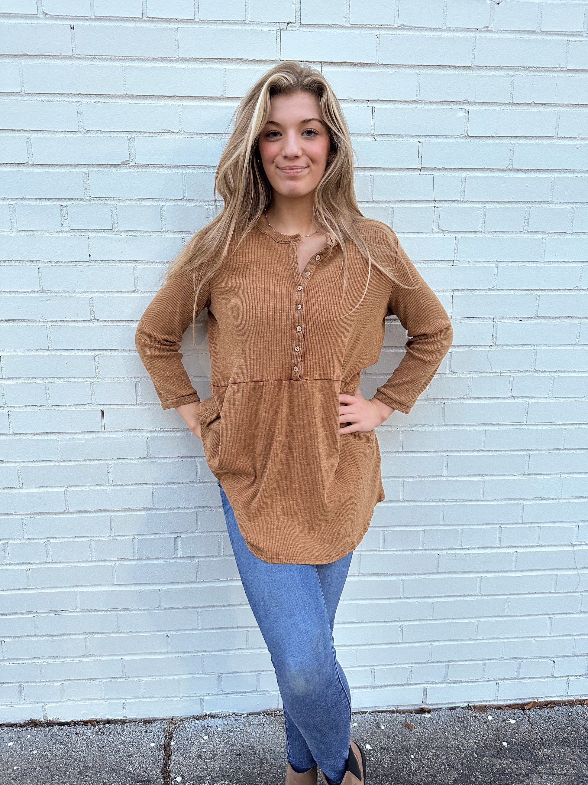 Mineral washed ribbed button front tunic top in camel.